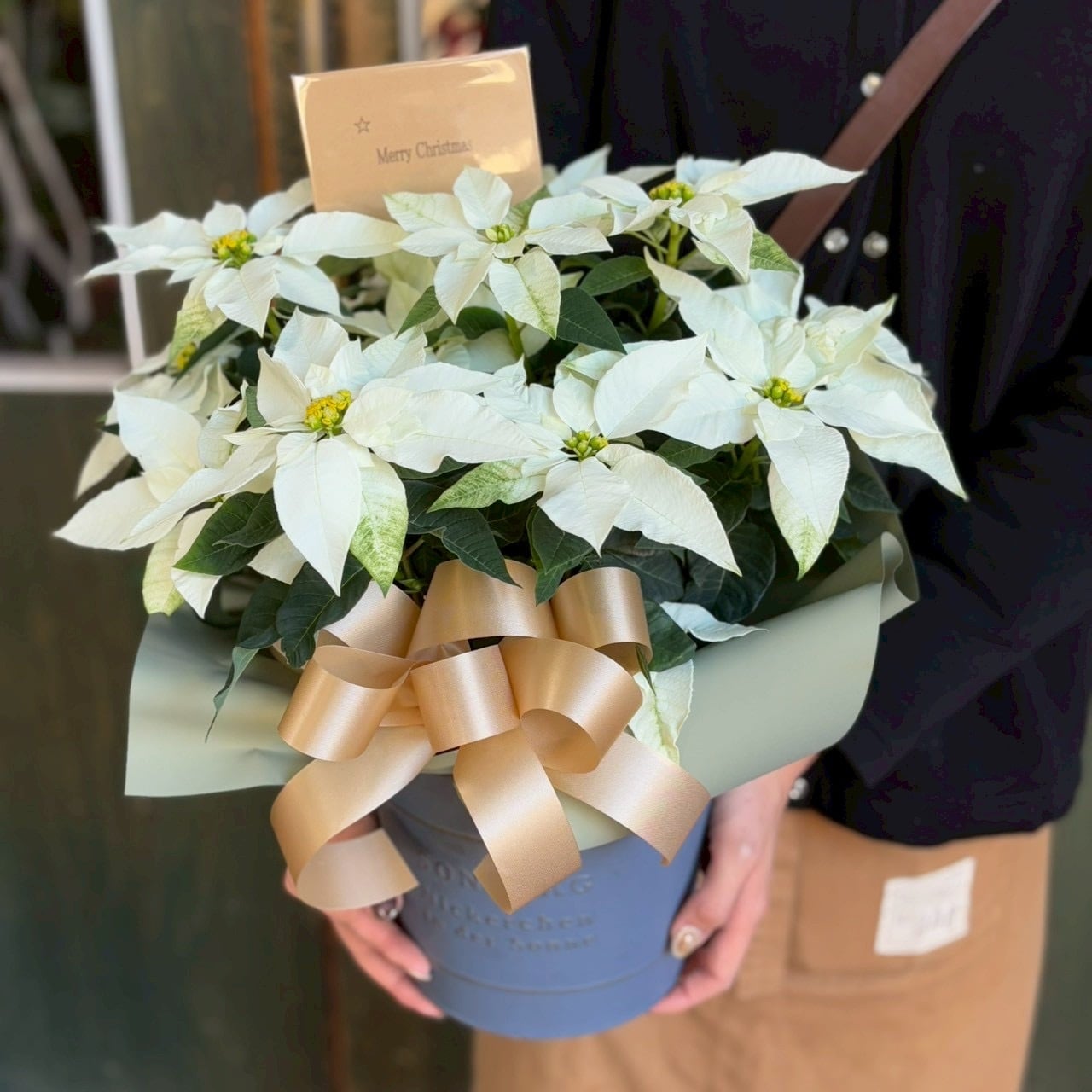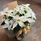 雪のようなホワイトカラーが特徴のプリンセチアは、特別な日のプレゼントにぴったりです。大切な人への思いやりを込めて、素敵なクリスマスを演出しましょう!ギフト用鉢カーバー付き。